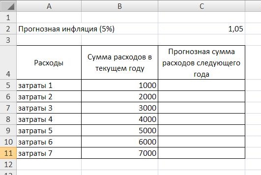 Индексируем первую строку, путем умножения затрат текущего периода на индекс инфляции.