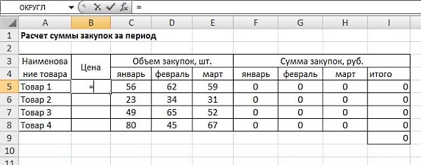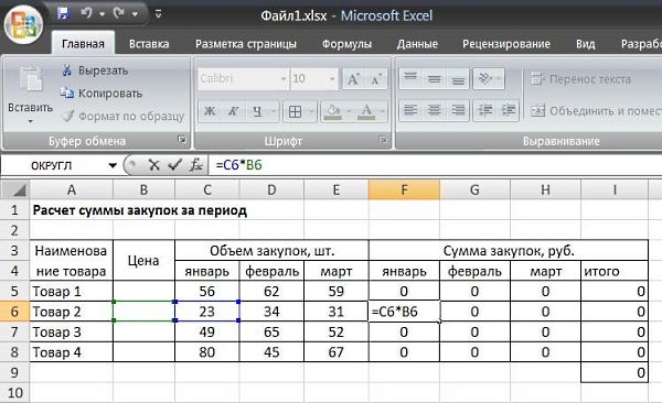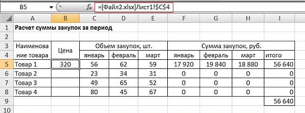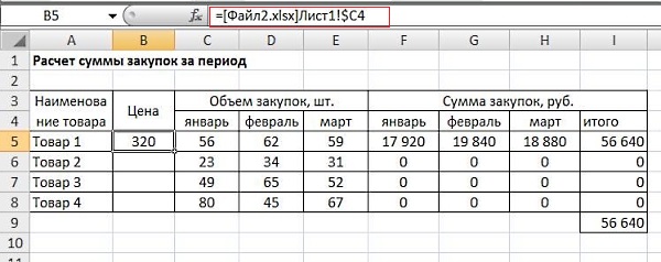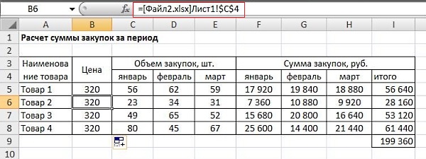 Видим, что в расчете цены в рублях опять же использована абсолютная ссылка. Есть второй файл, где рассчитывается сумма закупок за период: