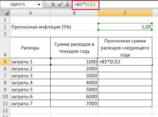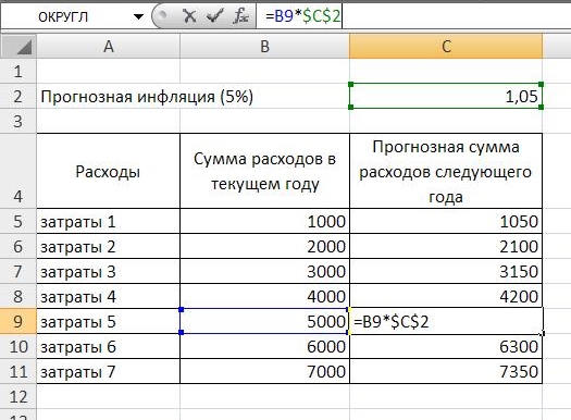Абсолютная и «полуабсолютная» ссылка в Excel 2007-2010-2013Абсолютная ссылка – это ссылка на одну и ту же ячейку в разных столбцах или строках. Использование абсолютной ссылки позволяет значительно сократить время при произведении аналогичных расчетов в большом массиве данных. Например, мы хотим проиндексировать расходы текущего периода на инфляцию для планирования следующего года:
