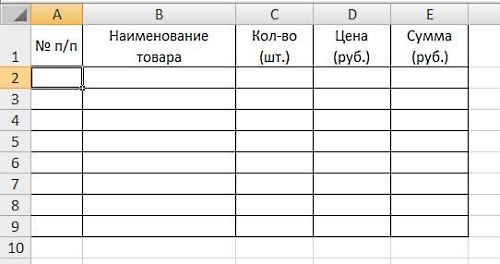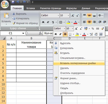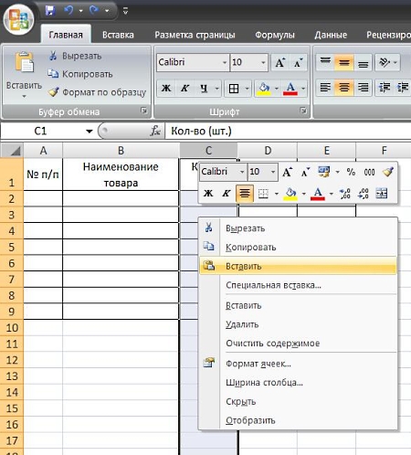 Как добавить столбец или строку в таблицу в Excel 2007-2010Итак, мы сформировали таблицу, установили нужную ширину столбцов, центрировали содержимое шапки, произвели перенос слов и оформили границы.