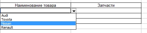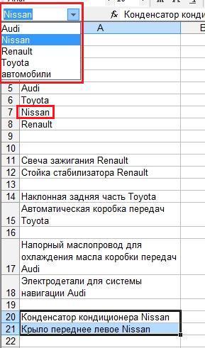 Итак, для начала создадим список автомобилей, а также список запчастей для каждой марки а/м и дадим им названия таким образом, как это описано в предыдущем уроке. Получаем: