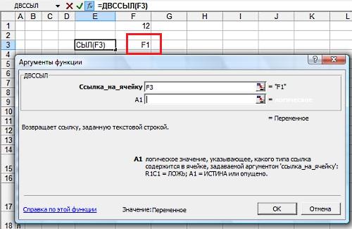 и дает возможность ссылаясь на ячейку, где указано имя другой ячейки, сослаться на эту вторую ячейку. Выбираем в окошке ссылка на ячейку F3. Как видим в этой ячейке указано название ячейки (F1), на которую мы в результате хотим сослаться.