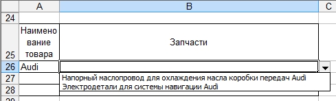 Как видим при выборе автомобиля Audi в столбце "Запчасти" выпадает список только с запчастями по этой марке машины. То же самое произойдет и при выборе других автомобилей.