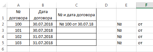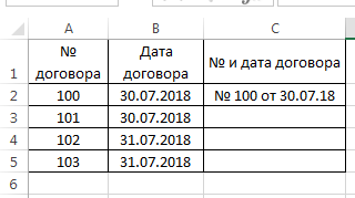 Как объединить в ячейке Excel данные из разных ячеек. Функция & в Excel 2007-2010-2013Предположим, что у нас есть таблица, где номер и дата договора указаны в разных ячейках, а нам нужно объединить их в одну: