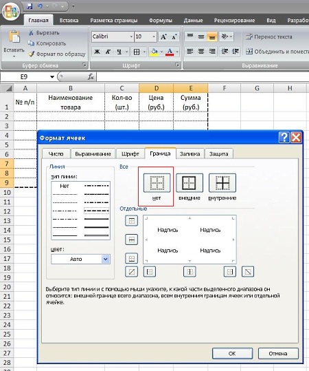 Для того, чтобы убрать границы, нажимаем кнопку «нет»: