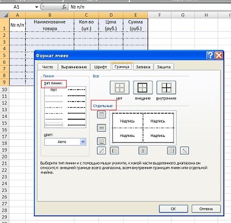 Находим вкладку «Граница». Выбираем тип линии, после чего нажимаем на кнопку «внешние» или «внутренние», в зависимости от того, какую границу хотим нарисовать. Например: