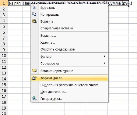 Выделяем область предполагаемой таблицы и, удерживая курсор на выделенной области, вызываем меню правой кнопкой мыши. Выбираем «Формат ячеек»: