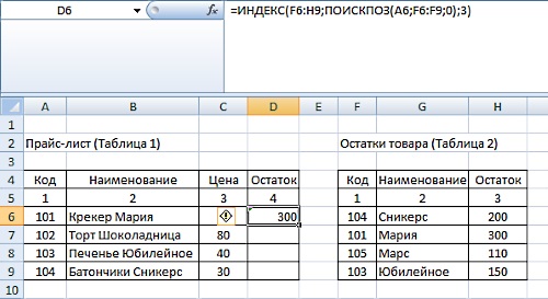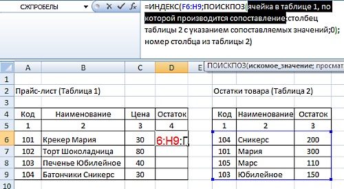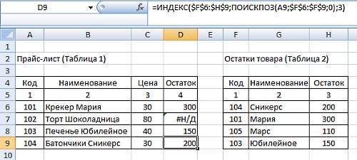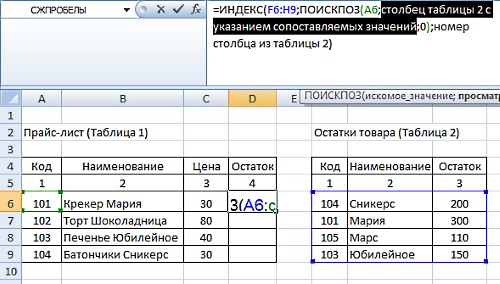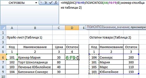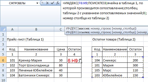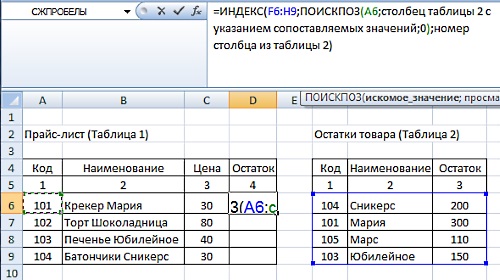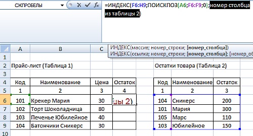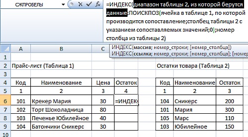Как сопоставить данные двух таблиц в Excel 2007-2010-2013. Функции ИНДЕКС и ПОИСКПОЗПредположим, что у нас есть две таблицы со схожими значениями. Нам необходимо сопоставить эти значения и перенести (подтянуть) данные из одной таблицы в другую. Это можно сделать с помощью совмещения функций ИНДЕКС и ПОИСКПОЗ. Главное условие - наличие абсолютно схожих колонок (например, код, наименование, сумма и пр.). Формула будет выглядеть следующим образом: =ИНДЕКС(диапазон таблицы 2, из которой берутся данные;ПОИСКПОЗ(ячейка в таблице 1, по которой производится сопоставление;столбец таблицы 2 с указанием сопоставляемых значений;0);номер столбца из таблицы 2) Приведенную формулу можно скопировать и вставить в ячейку Excel. Части формулы, выделенные разными цветами, подлежат изменению. Итак, перейдем к практике. Предположим, что у нас есть прайс-лист (коды и цены указаны условно) и таблица с остатками товара на складе, причем товар в этих таблицах указан в разном порядке, что не позволяет поставить таблицы рядом. Нам необходимо подтянуть данные по остаткам товара из таблицы с остатками в прайс-лист.
