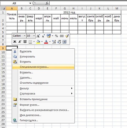Активизировать любую свободную ячейку, вызвать меню правой кнопкой мыши и выбрать «специальную вставку»: