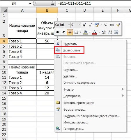 Выделяем ячейку, содержащую формулу, и, удерживая на ней курсор, вызываем меню с помощью правой клавиши мыши. Выбираем «Копировать».