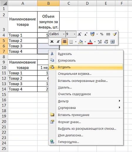 Выделяем диапазон, в который хотим вставить формулу, и, удерживая на нем курсор, вызываем меню с помощью правой клавиши мыши. Выбираем «Вставить».