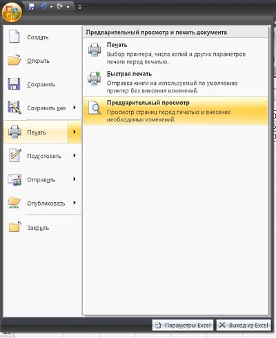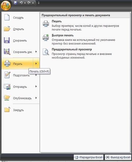 Печать документа. Как распечатать отдельные страницы в Excel 2007-2010Итак, мы произвели предварительный просмотр страницы, убедились в том, что на листах нет лишней информации, и что информация представлена в читабельном виде. Для печати документа предусмотрено два способа: 1. Через кнопку Печать, в закладке «office»