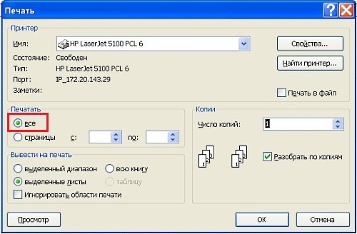 Если мы через предварительный просмотр убедились, что хотим распечатать документ целиком, просто нажимаем на кнопку ОК, оставляя выделенным окошко «все». Если же у нас есть необходимость напечатать отдельные страницы документа, либо часть документа, воспользуемся окошками «страницы с … по …».