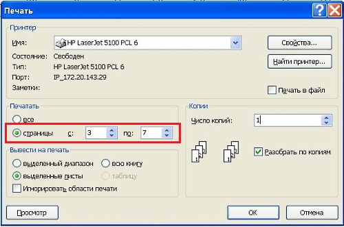 Выберем нужные страницы и нажмем ОК. В случае необходимости печати одной страницы в середине документа, выбирается данная страница: