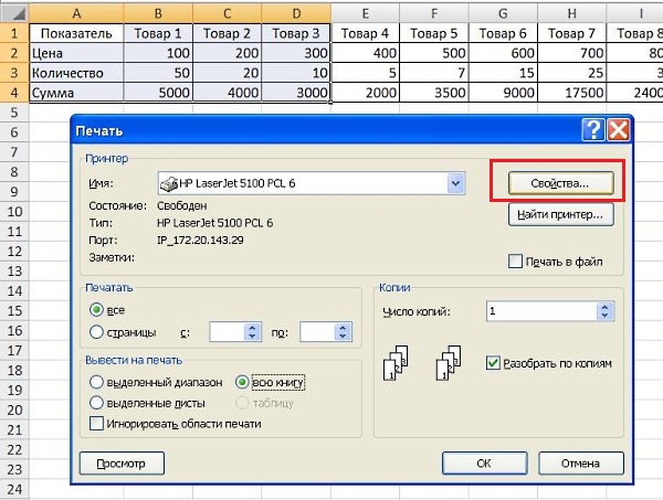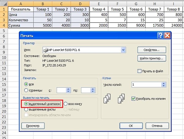 Помимо печати отдельных страниц, Excel предоставляет возможность распечатать заданный диапазон. Для этого выделяем нужный диапазон, вызываем функцию печати и выбираем вывод на печать «выделенного диапазона»: