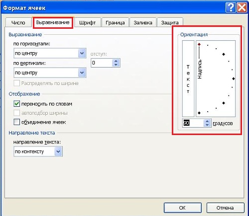 Во вкладке «Выравнивание» устанавливаем ориентацию текста на 90 градусов.