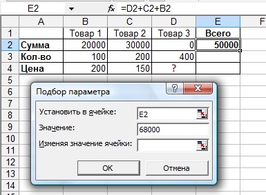Установим в окошке "Значение" сумму продаж, на которую мы должны выйти - 68000 рублей: