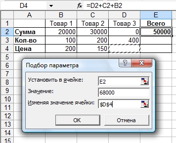 Функция "Подбор параметра" позволяет подобрать значение одного показателя, при изменяемом другом. Например: x + 100 = y. Задавая значение y, можно найти значение x.