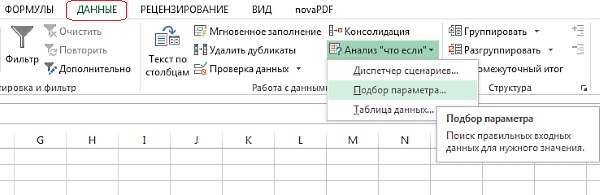 Для этого активизируем ячейку, где указана общая сумма продаж, и найдем функцию "Подбор параметра" через "Анализ что если" в закладке "Данные" главного меню: