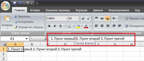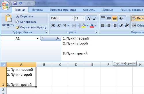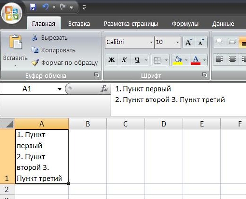 Предположим, что в одной ячейке Excel у нас находится список с нумерацией, и мы хотим, чтобы каждый новый пункт начинался с новой строки. Например: