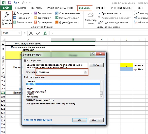 Во вкладке "Формулы" находим "Вставить функции", выбираем категорию "Текстовые" и находим "СЦЕПИТЬ".