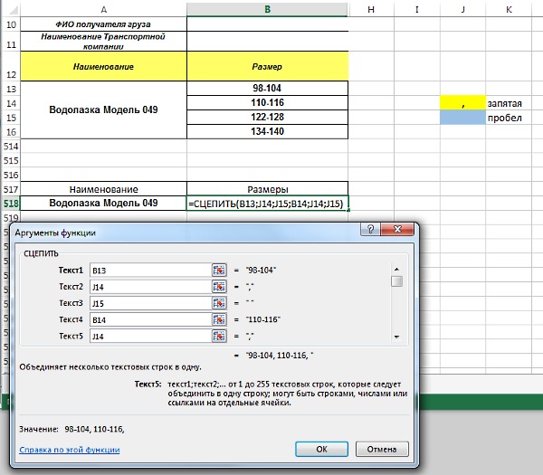 В нашем случае это пробел и запятая. Активизируем одну ячейку и внесем туда ",", в другой ячейке поставим пробел: