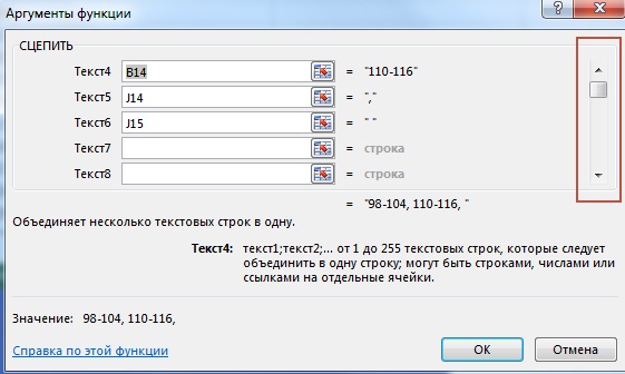 Если сцепляемых значений больше, чем полей в окошке, используем бегунок для перехода к следующим полям: