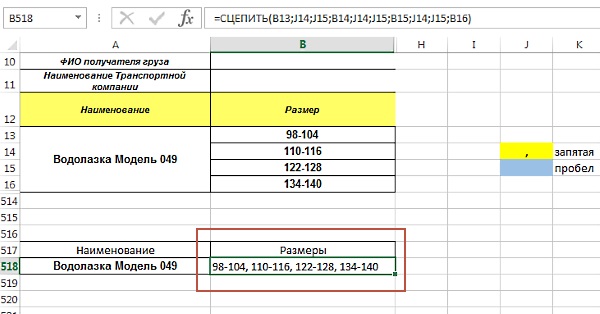 В любом месте на листе Excel заведем в ячейки символы, используемые для сцепления данных.