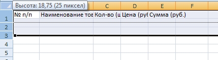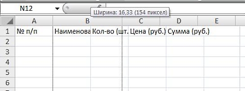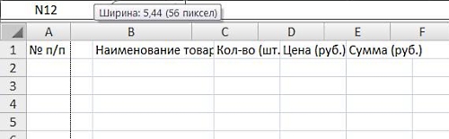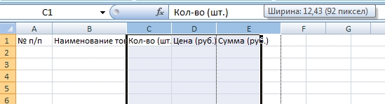 Сделаем столбец с наименованием более широким, колонку с нумерацией строк - более узкой, а три оставшиеся столбца - расширим одновременно. Для этого ставим курсор на серое поле на границу между ячейками B и C, нажимаем на левую кнопку мыши и, не отпуская, тянем вправо:
