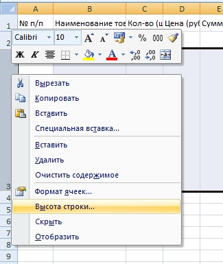 Бывают случаи, когда ячейка настолько широка или высока, что не помещается в видимую часть листа. Для того, чтобы сузить такой столбец или строку можно использовать функция "Высота строки" или "Ширина столбца". Для этого выделяем нужную строку, и, не убирая курсора с выделенной области, нажимаем на правую клавишу мыши.