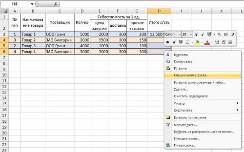 Выделяем ячейки, в которые хотим вставить формулу, и в меню, вызванном правой клавишей мыши, выбираем «Специальная вставка»: