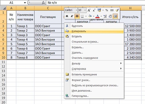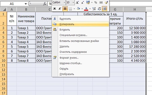 Выделяем все поле таблицы и, не убирая с нее курсора, вызываем правой клавишей мыши меню и выбираем «Копировать»: