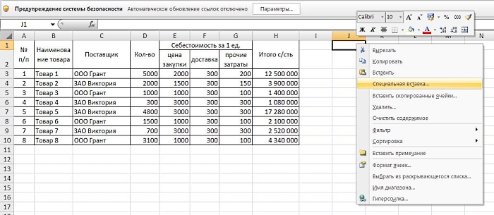 Способ 1. Копирование таблицы с помощью специальной вставки