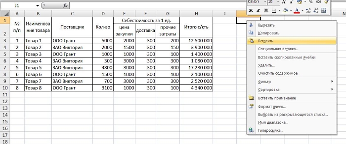Выбираем любую ячейку (обязательно!) первой строки, и, не убирая с нее курсора, вызываем правой клавишей мыши меню и нажимаем «Вставить»: