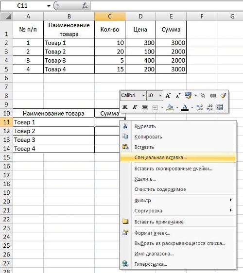 Далее выделяем полностью соответствующий диапазон, в который хотим вставить значения, либо его верхнюю ячейку и, не убирая курсора с выделенной области, вызываем правой клавишей мыши меню, выбираем «Специальная вставка»: