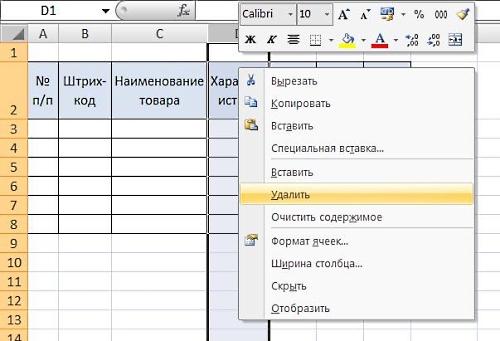 На данный момент нам не нужна колонка «Характеристика». У нас два варианта: временно скрыть ее или удалить безвозвратно. Для того, чтобы удалить колонку, выделяем ее по серому полю и, удерживая курсор на выделенной области, вызываем правой клавишей мыши меню и выбираем «Удалить» :