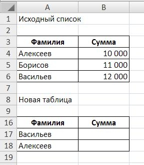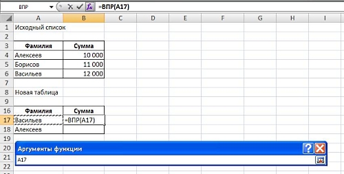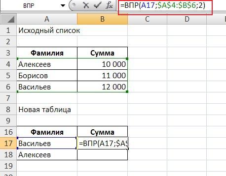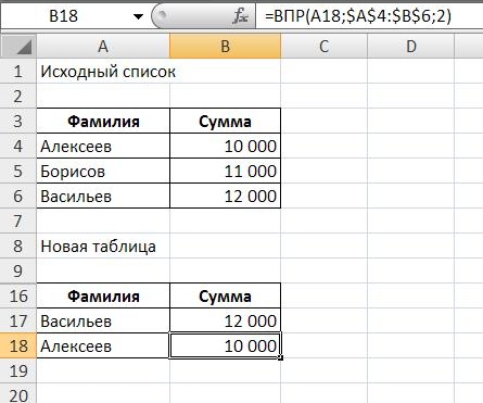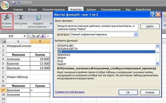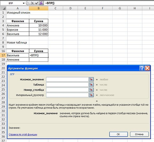Как мы видим, данные в исходной таблице расположены по алфавиту. Данные же в новой таблице могут располагаться в любом порядке и не обязательно полным списком. Функция ВПР поможет найти сумму по каждому сотруднику и перенесет ее в графу новой таблицы рядом с фамилией. Итак, активизируем нужную ячейку, например, рядом с фамилией «Васильев» и вызываем функцию: