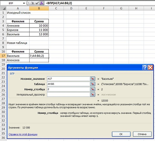 Нажимаем ОК и видим, что функцию ВПР нашла сумму по Васильеву из исходной таблицы.